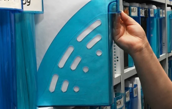 Стеллажи с ящиками помогают организовать адресное хранение медицинских карточек и получить к ним удобный доступ.