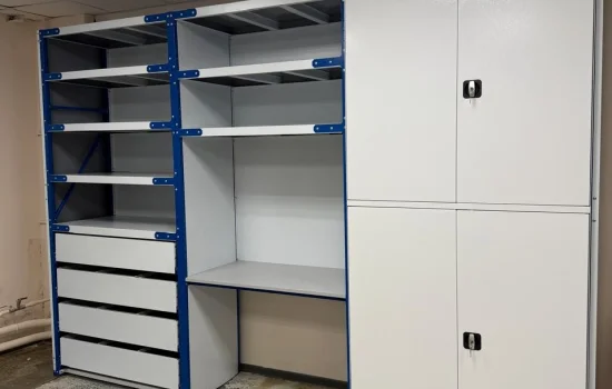 Рабочее место, встроенное в стеллажный комплекс, обеспечивает удобство работы с инструментами. Все необходимое находится под рукой, что снижает нагрузку на спину и повышает производительность труда.