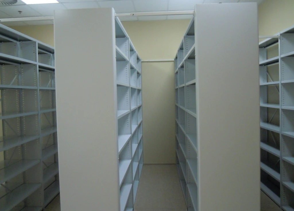 Системы компактного архивного хранения документов. Вдвое повышается вместимость под папки или сокращаются занимаемые площади . Используются двухсторонние передвижные стеллажи для архивохранилища.